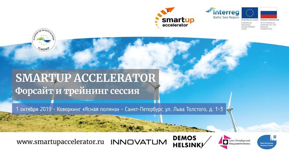С 09:00 до 14:00 в Коворкинге «Ясная Поляна», по адресу: Санкт-Петербург, улица Льва Толстого 1,с участием экспертов международного консорциума «Санкт-Петербургский Кластер Чистых технологий для городской среды» состоялась форсайт-сессия SmartUp Accelerator, Сессия прошла в рамках реализации проекта Innovation Ecosystem to foster consumer cleantech markets in the Baltic Sea Region Программы трансграничного сотрудничества региона Балтийского моря ИНТЕРРЕГ РБМ 2014-2020. Организатор сессии: РИЦ-Петербург. Также, в рамках проекта, ежегодно проводится международный конкурс среди МСП для участия в акселерационной программе, победитель конкурса получает возможность пройти оплаченную стажировку, где ему предоставляется индивидуальная поддержка от международной команды менторов и экспертов.