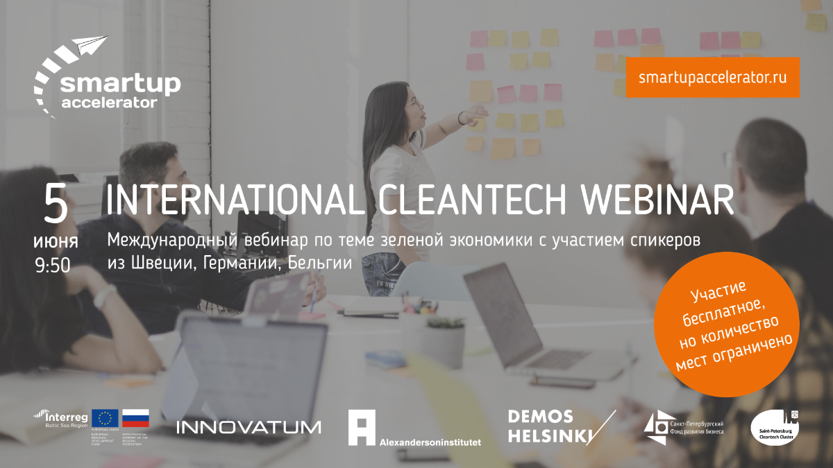 5 июня, во Всемирный день экологии, консорциум проекта при участии международного консорциума «Санкт-Петербургский Кластер Чистых технологий для городской среды» / Saint-Petersburg Cleantech Cluster for urban environment проводит International Cleantech Webinar. Вебинар посвящен вопросам цикличной экономики, развитию зеленые технологии в сфере B2C и тенденциями развития отрасли Cleantech. Примите участие в международном вебинаре и узнайте больше о будущем индустрии чистых технологий в регионе Балтийского моря. Мероприятие организовано в рамках проекта Innovation Ecosystem to foster consumer cleantech markets in the Baltic Sea Region (SMARTUP ACCELERATOR) / Инновационная экосистема для стимулирования потребительского рынка чистых технологий в регионе Балтийского моря Программы трансграничного сотрудничества «ИНТЕРРЕГ. Регион Балтийского моря». Вебинар пройдет на английском языке. Участие бесплатно при условии предварительной регистрации.