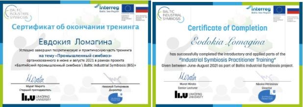 Получением международных сертификатов успешно завершились теоретическая и практическая часть тренинга на тему «Промышленный симбиоз», организованного в июне и августе 2021 года в рамках проекта «Балтийский промышленный симбиоз» Программы трансграничного сотрудничества Россия-ЕС «Интеррег. Регион Балтийского моря».